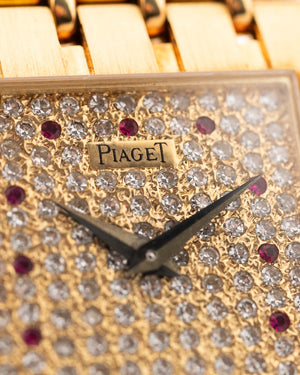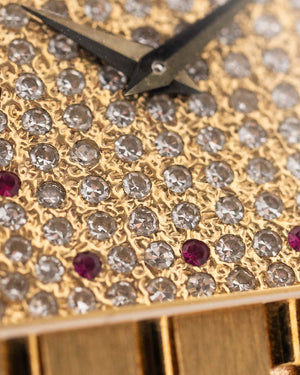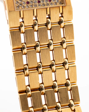 The geometric forms combined with the integrated 18k yellow gold bracelet and white and ruby factory diamond setting, alpha handset and classic logo are a true piece of art.