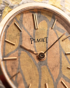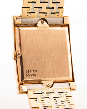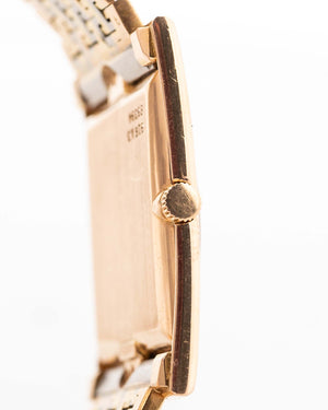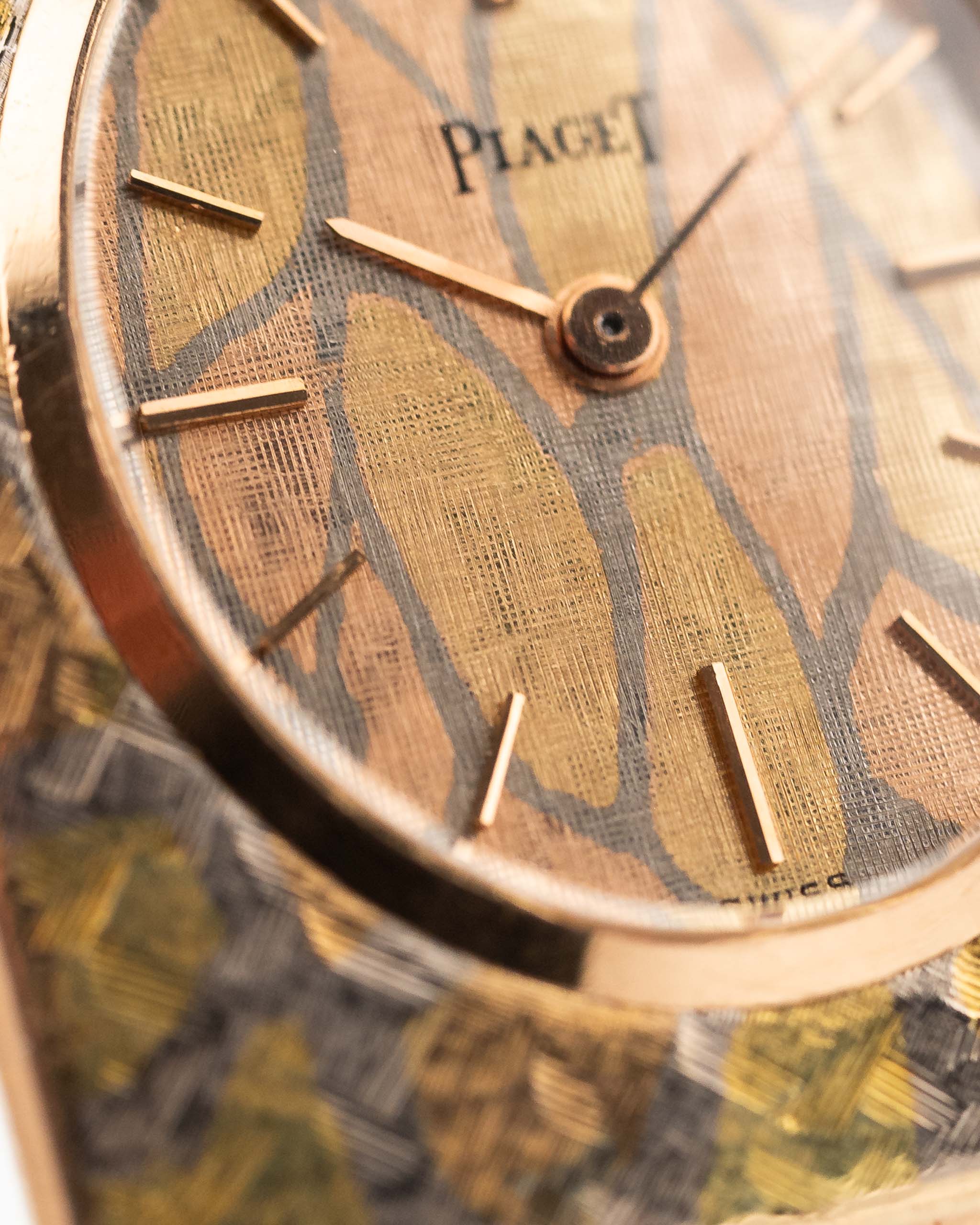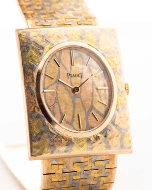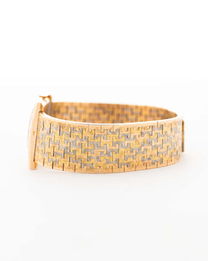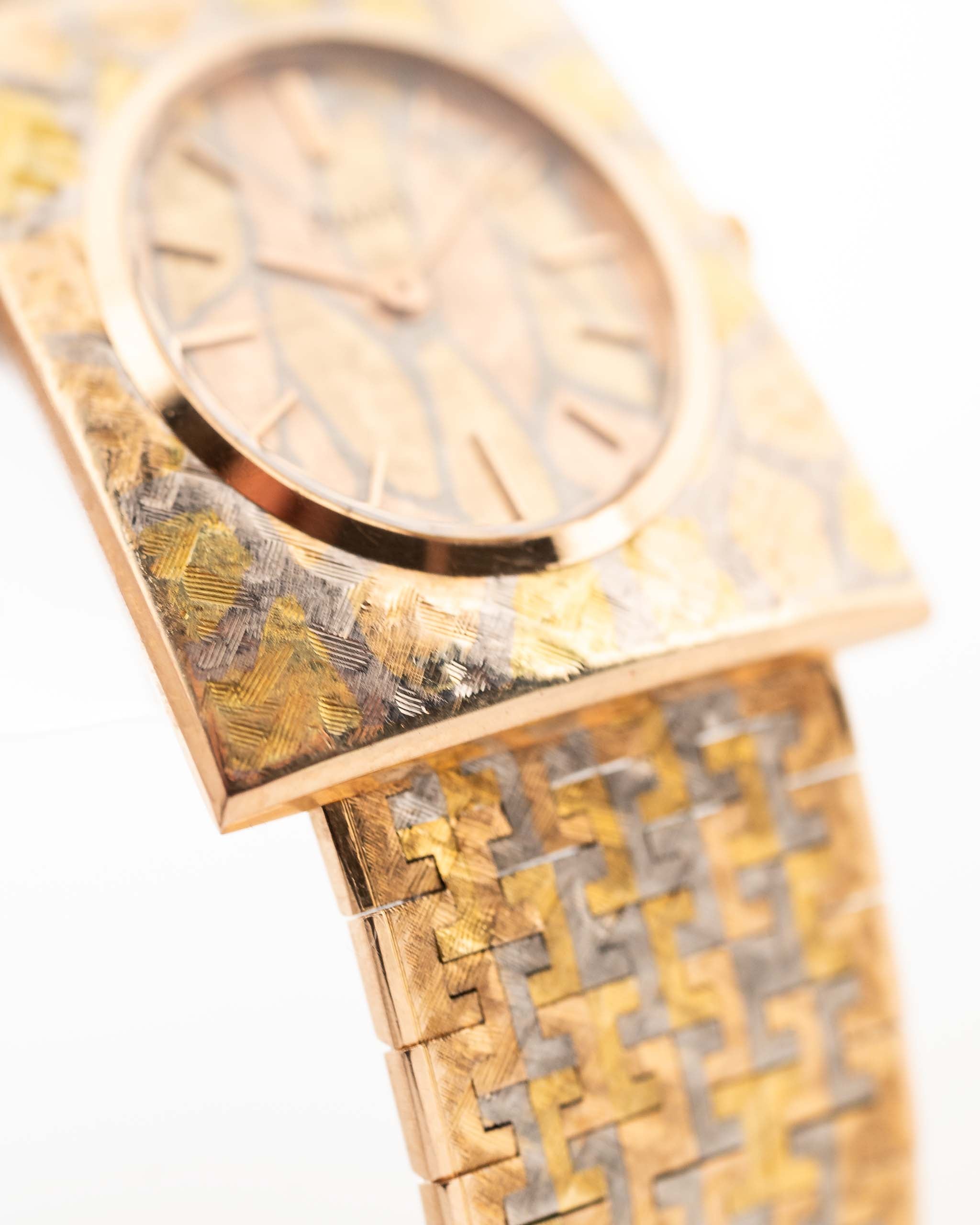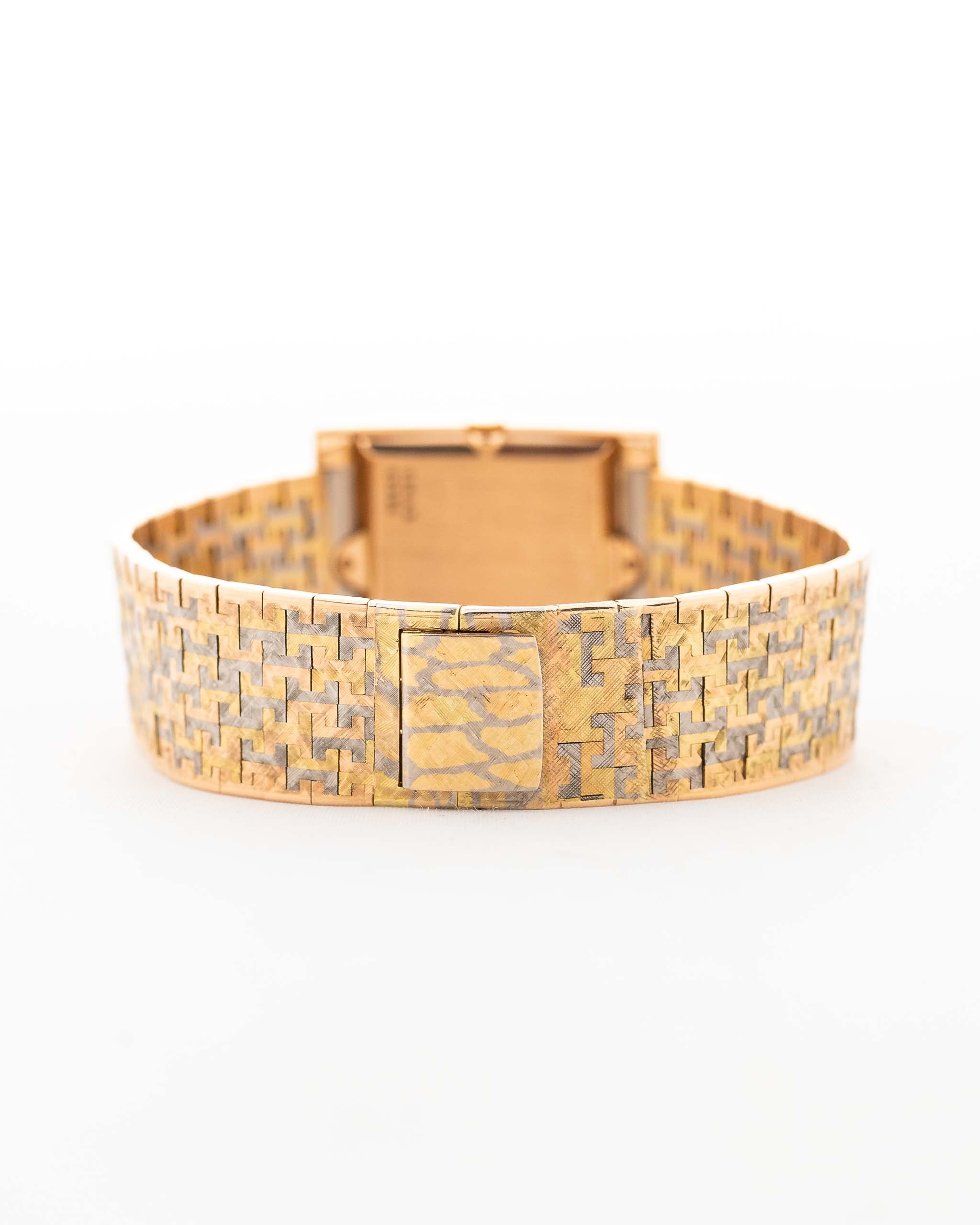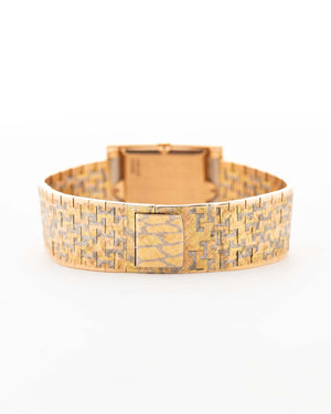 This took our breath at first sight. These geometric forms combined with the forged 18k gold bracelet, case and dial made of elements in white, yellow and rose gold are one of the rarest to find. Stick handset and hour markers with classic logo makes this piece of art complete.