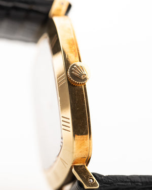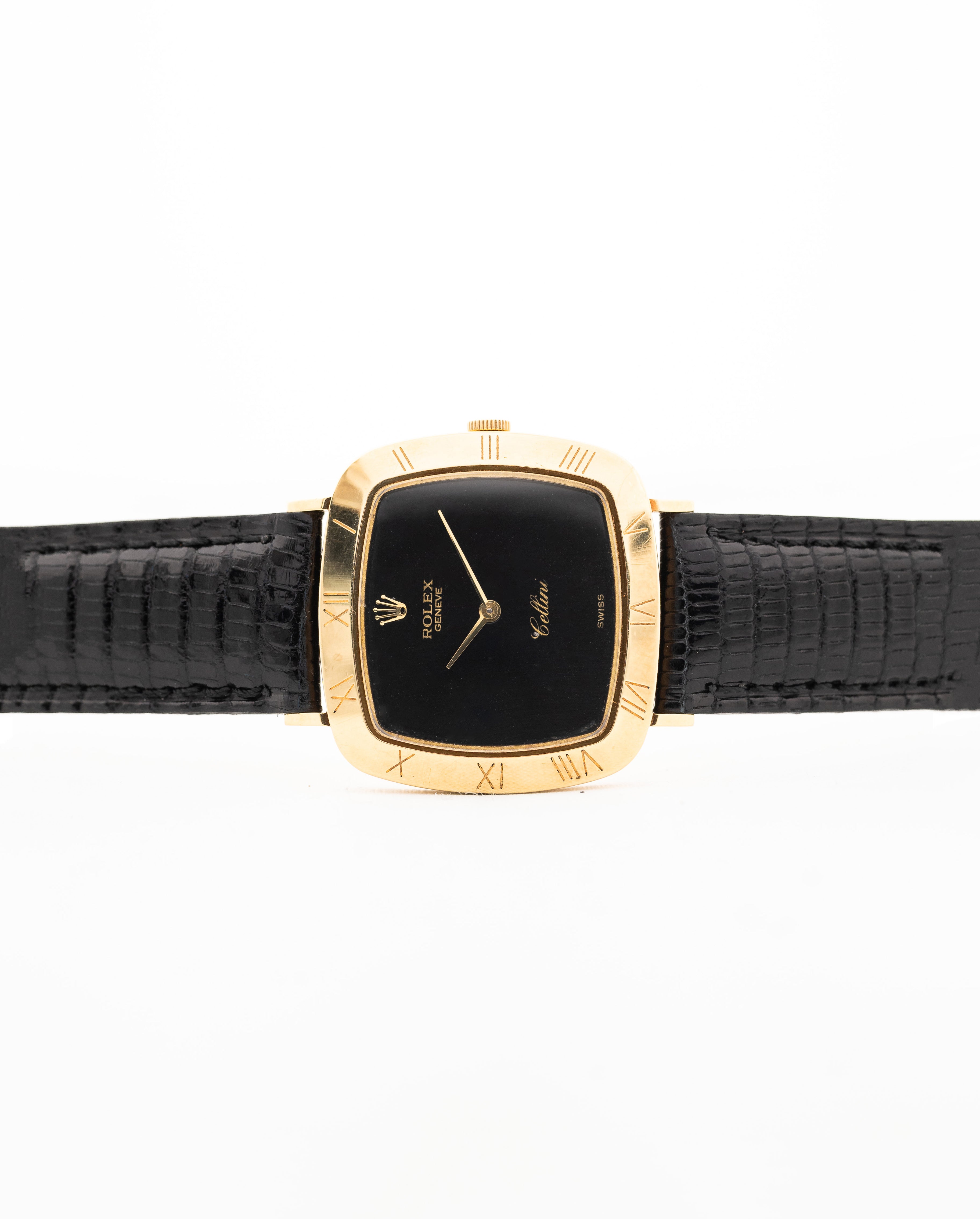 The Cellini line showcases the dressier side of compared to its more well-known sport models. This version is fitted in a 18k-yellow-gold square-shaped case, which is an unusual case shape for .