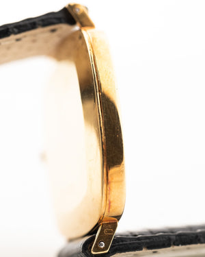 The dial color is black which was a popular color for dress watches produced in this era. This model is quite versatile in that it can be comfortably worn in casual or a black-tie settings and the roman numerals on the bezel are the icing on the cake.