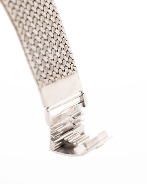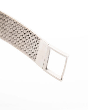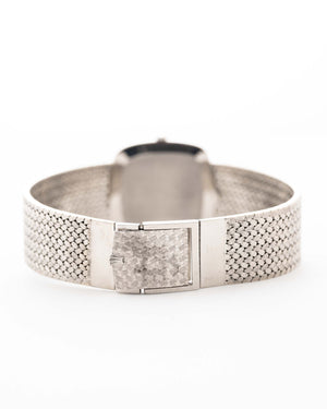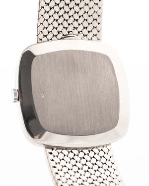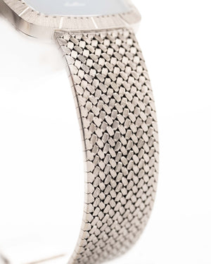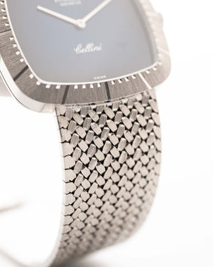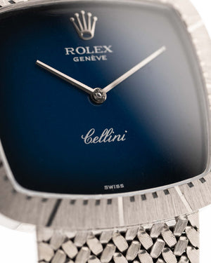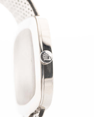 The Cellini line showcases the dressier side of compared to its more well-known sport models. This version is fitted in a 18k-white-gold square-shaped case, which is an unusual case shape for .