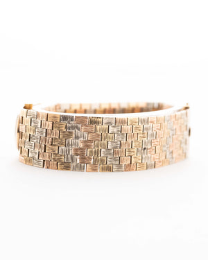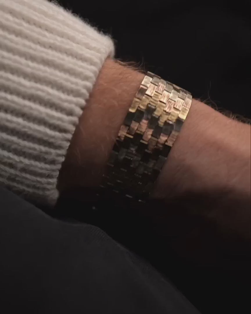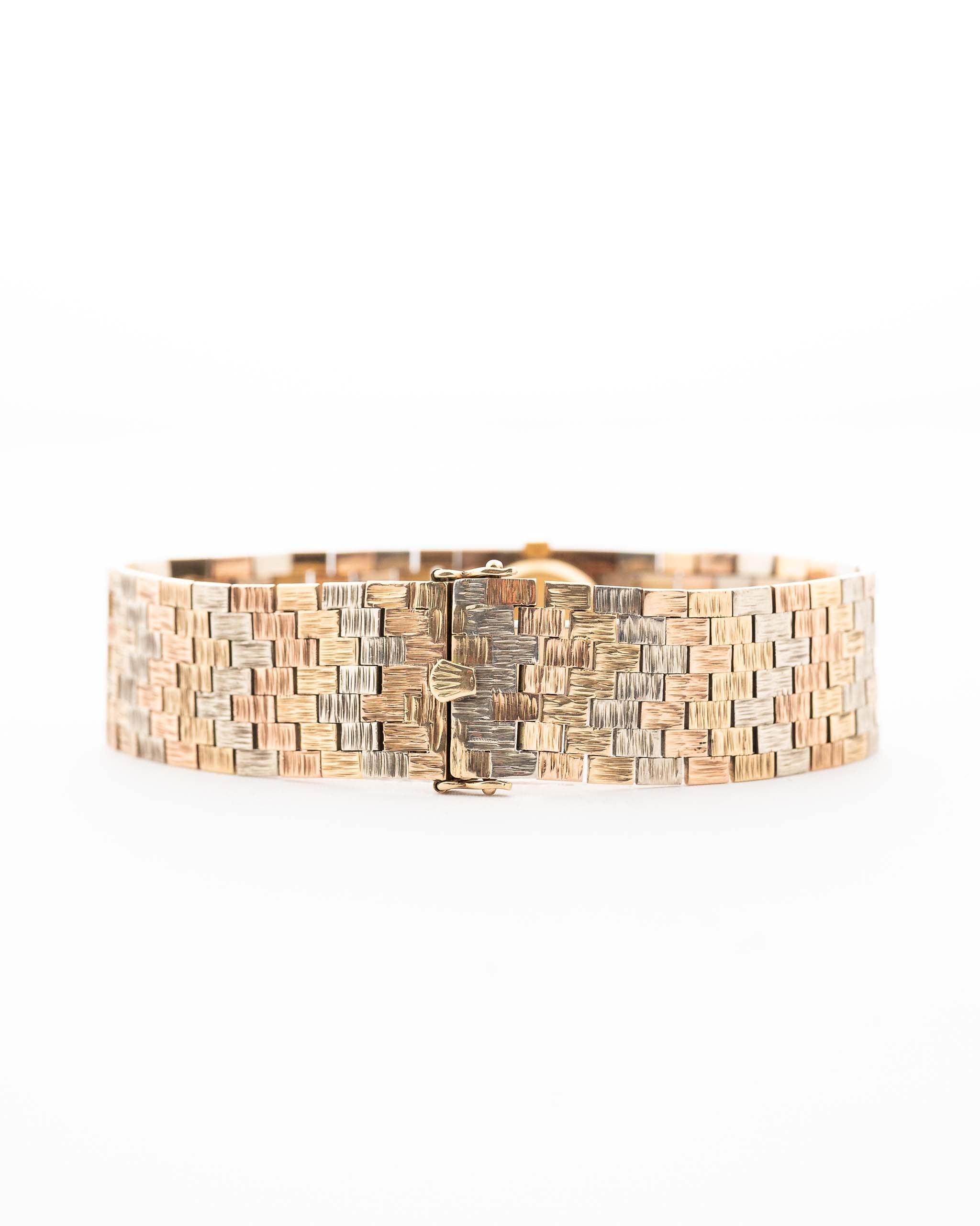 This particular model is distinguished by its rare Trinity 9 carat gold bracelet, an exquisite blend of yellow, white, and rose gold links that create a harmonious tri-tone aesthetic—both sophisticated and versatile.